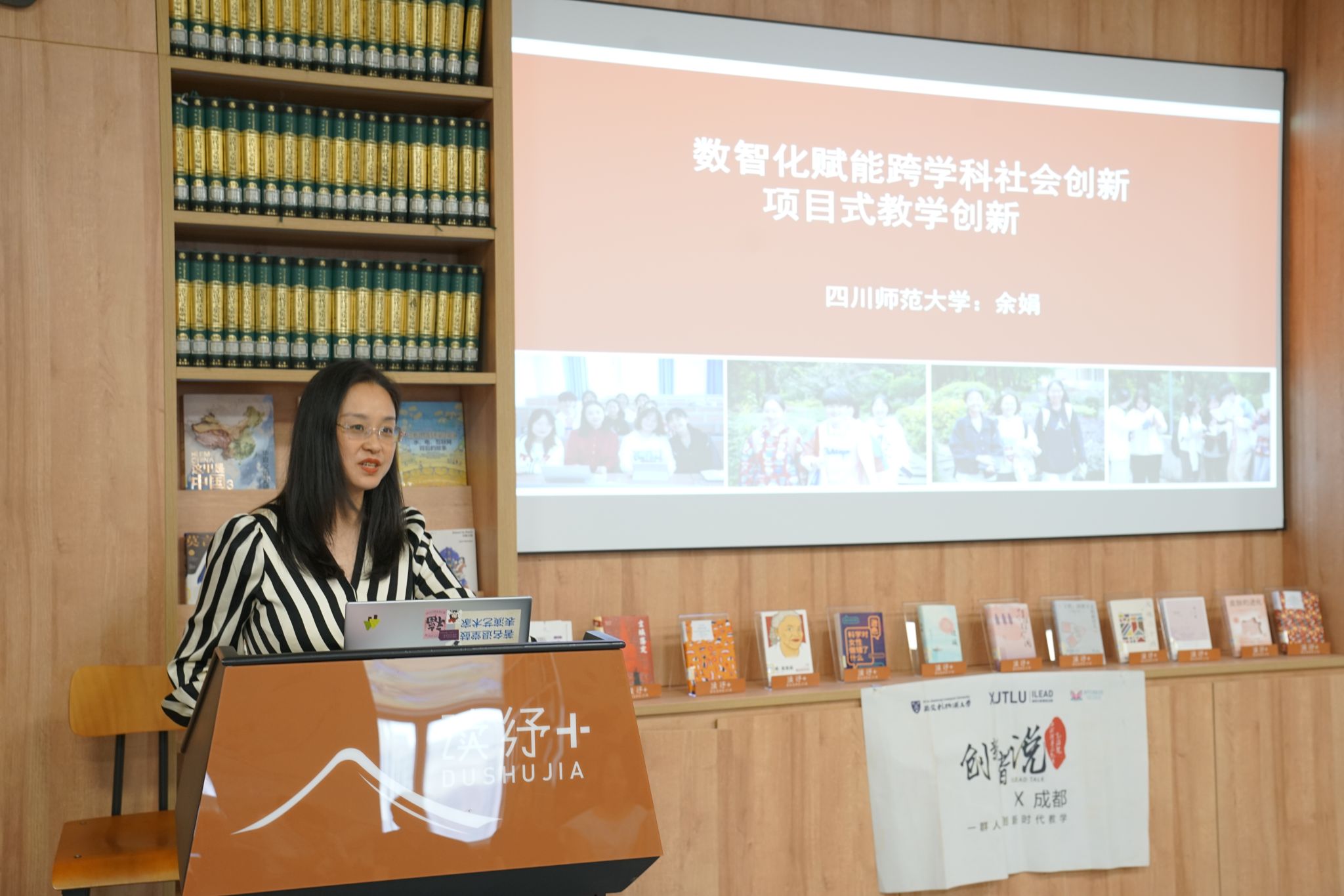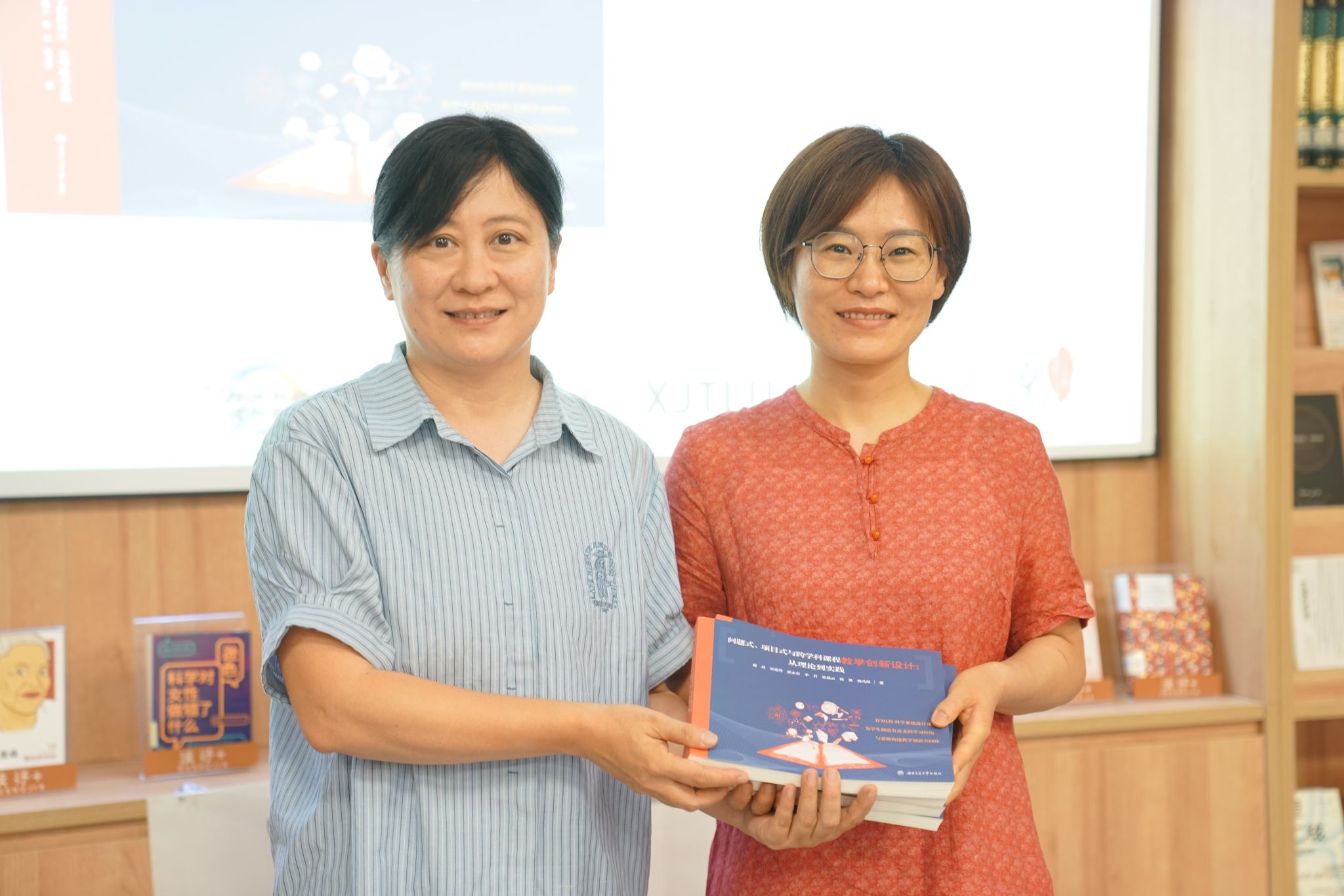 在分享结束后,郝莉院长进行《问题式、项目式与跨学科课程教学创新设计:从理论到实践》的新书发布环节。该书凝结了多位教育工作者的智慧与心血,旨在为教学创新提供理论指导与实践经验。随后,本书被郑重捐赠给学校图书馆,图书馆代表刘云老师现场颁发了捐赠感谢状,对这份宝贵的知识馈赠表示衷心感谢,并表示这些书籍的加入将极大地丰富馆藏资源,惠及更多学子与教师。