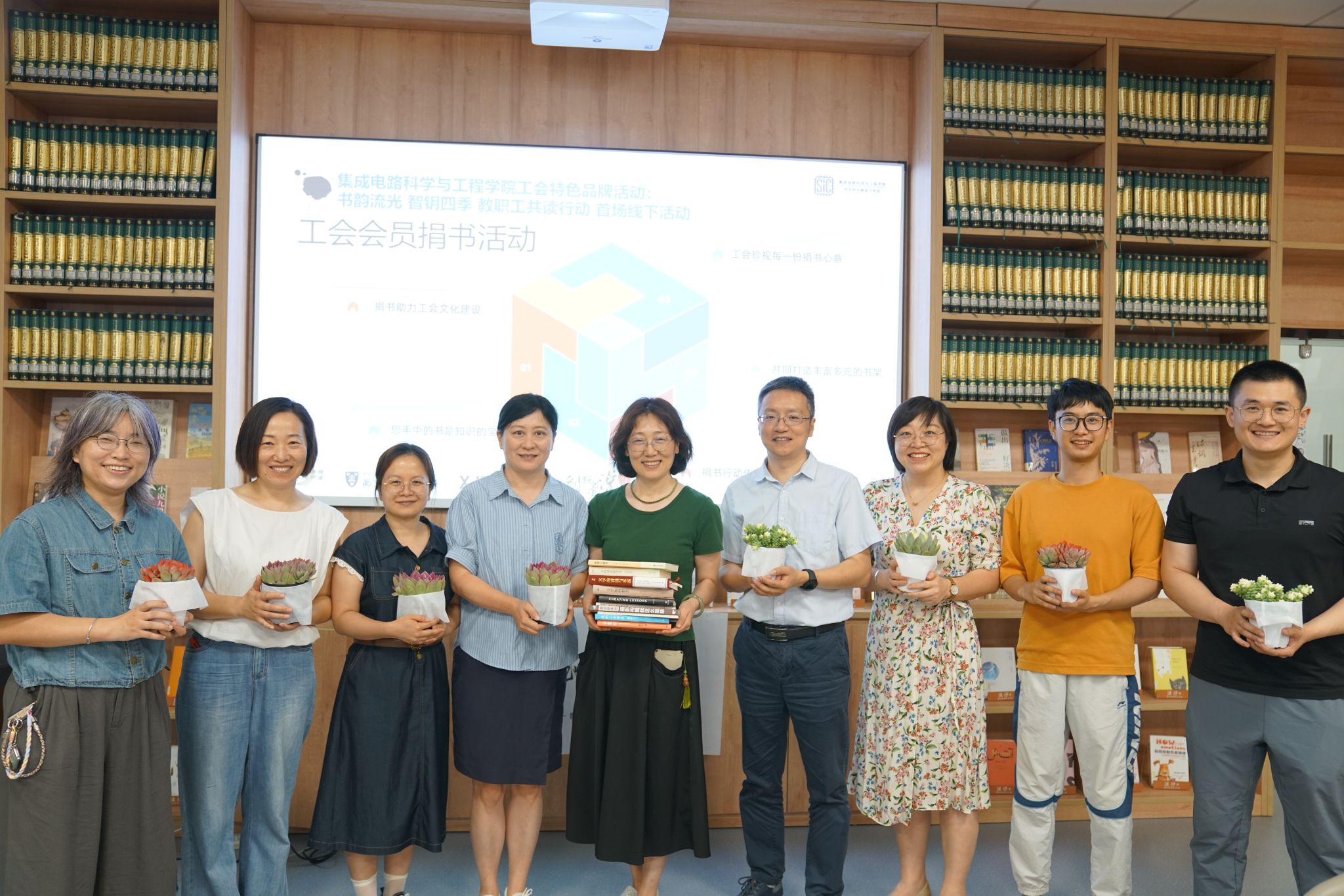 紧接着,现场举行了一场温馨的书籍捐赠活动。集成电路科学与工程学院多位教师积极响应,将珍爱的书籍捐赠给学院工会,以实际行动支持资源共享和绿色阅读。学院工会主席吕雁老师对教师们的积极参与表示感谢,并回赠了鲜花,象征着知识的传递与情感的交流,现场气氛温馨而感人。