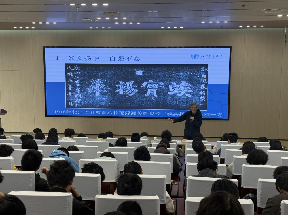 梁教授解读了西南交大“精勤求学,敦笃励志,果毅力行,忠恕任事”的校训,阐释了“竢实扬华,自强不息”的交大精神。他提到,学校曾用过“中国交通大学”“北方交通大学”等校名,历经17次校名变更,却始终坚守育人初心。
