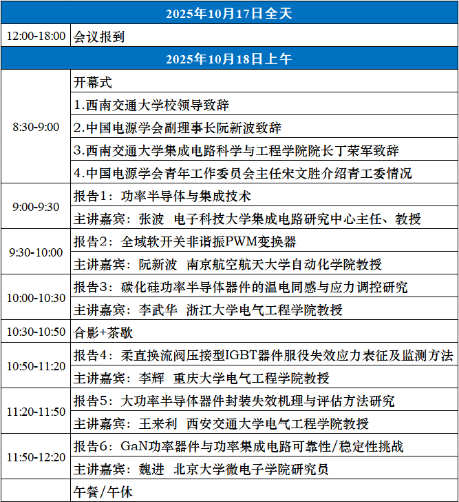 为把握发展机遇,汇聚顶尖智力,凝聚青年共识,由中国电源学会青年工作委员会主办,西南交通大学集成电路科学与工程学院承办的“中国电源学会第八期青年沙龙暨2025功率集成电路科技创新与前沿论坛”将于2025年10月17–18日在四川成都举办。本次论坛以“功率半导体与集成技术”为核心,旨在汇聚资深专家、青年才俊,构筑开放、前沿、务实的交流平台,深入探讨功率半导体器件与功率集成电路科技发展趋势,促进创新研究成果分享,共同开启高校学科建设与行业发展的新篇章。